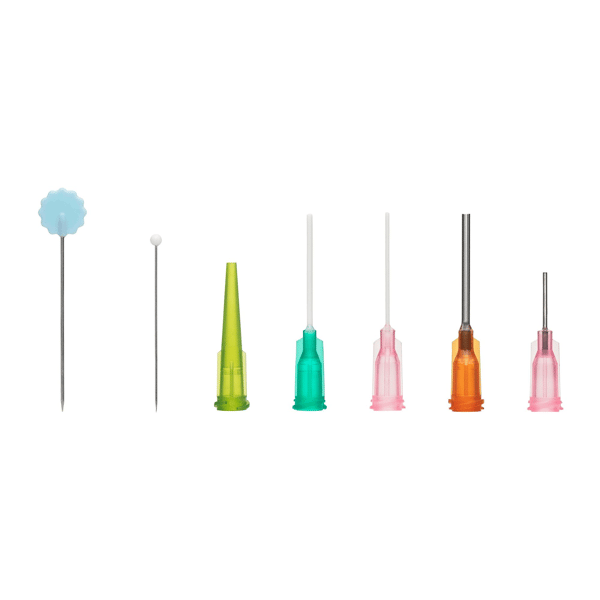 This kit also includes two replacement pins which are used to clear the needles of blockages.