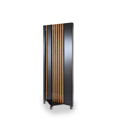 It is a three panels design fully symmetrical with two ribbon planar woofer panels (each woofer is 320mm wide) at the sides of a central element containing 5 ribbons: two 45mm wide midranges at the sides, two 25mm wide tweeters like Raffaello and one 9mm wide super tweeter in the center.