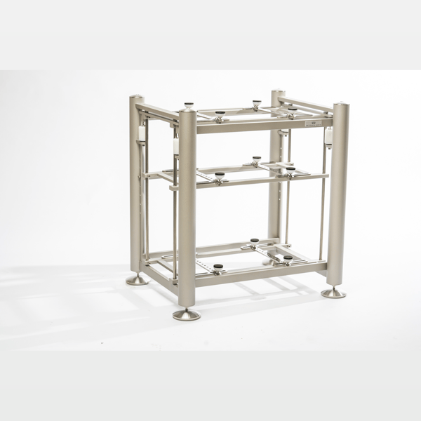 The internal frames are freely adjustable in height to place any size of component properly. They are locked on the vertical stainless steel bars of the suspended structure.