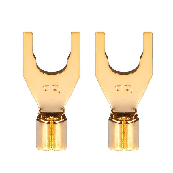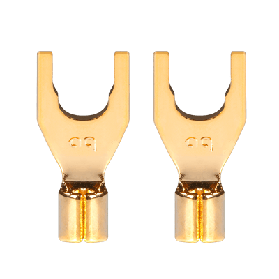 AudioQuest P10M Spade connectors fit 1/4" and 5/16" binding posts, will fit wire up to 10 AWG, and are supplied with 20 x red & 20 x black "boots" for a seamless-looking termination.