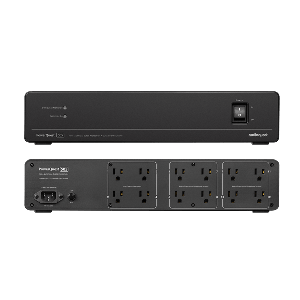 AudioQuest PowerQuest 505 is a high-performance power conditioner with 12 AC outlets (4 High-Current outlets for amplifiers and 8 Ultra-Linear-Filtered outlets for source components), a 2m detachable AC power cable featuring ZERO-Tech and RF/ND-Tech, and 2RU rack ears for simple rack-mounting.