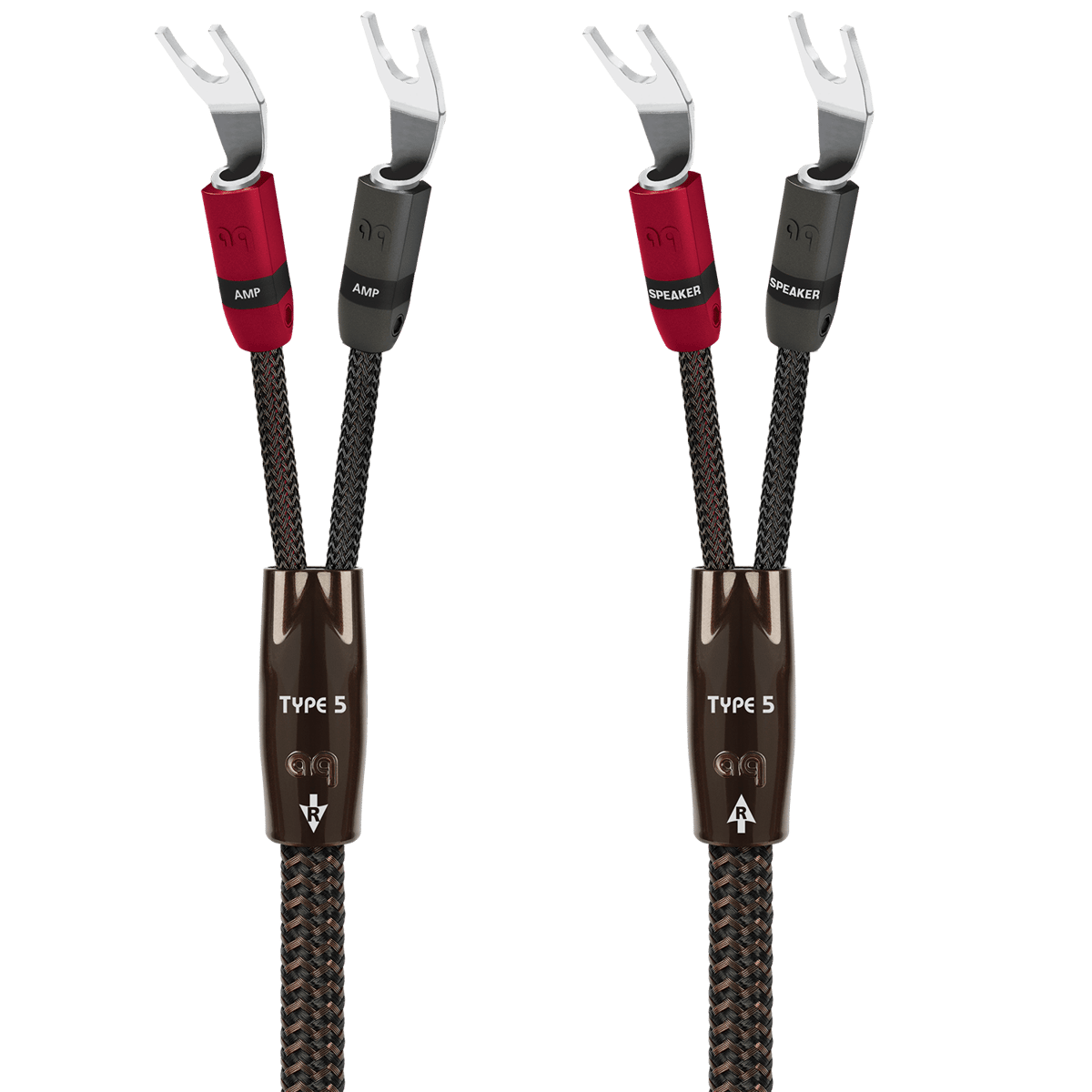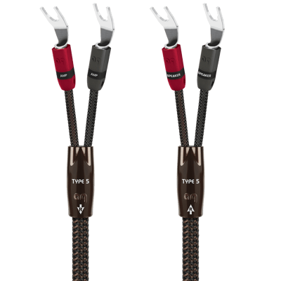 AudioQuest's Type 5, a direct descendant of our longtime high-value workhorse, Type 4, uses the same fundamental Star-Quad geometry as its predecessor but incorporates several important performance upgrades: Solid Perfect-Surface Copper+ Sonic-Signature conductors have been added to ensure a smoother, more natural sound. The outer diameter of the cable has increased, allowing more space between the individual conductors, decreasing distortion-causing interaction between adjacent conductors by 35%. While Type 5 is a superb full-range cable, it can also be doubled up to work as a very effective Double-BiWire combination cable. Type 5 is available in a black and brown braid, terminated with AudioQuest's high-quality SureGrip 300 connectors, or on spools—either braided or with a CL3/FT4 red-striped black PVC jacket.