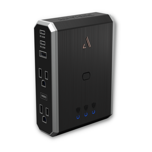 Surge protection regulates the power coming from the outside powerline to ensure devices do not burn out from a high voltage spike that can be harmful to your equipment. Flameless MOV Protection gives you peace of mind that powerful surges will not result in a dangerous fire. OverCurrent Protection ensures that the thermal protected power circuit cannot exceed 15 amps, which could cause devices to short circuit or create dangerous temperatures that may lead to a fire.