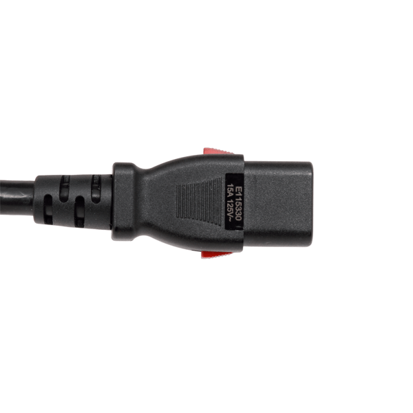 Our power cables feature a special self-locking IEC connector that is compatible with all standard IEC power-entry connectors. Locks automatically when inserted. Grasp by the red tabs to remove.