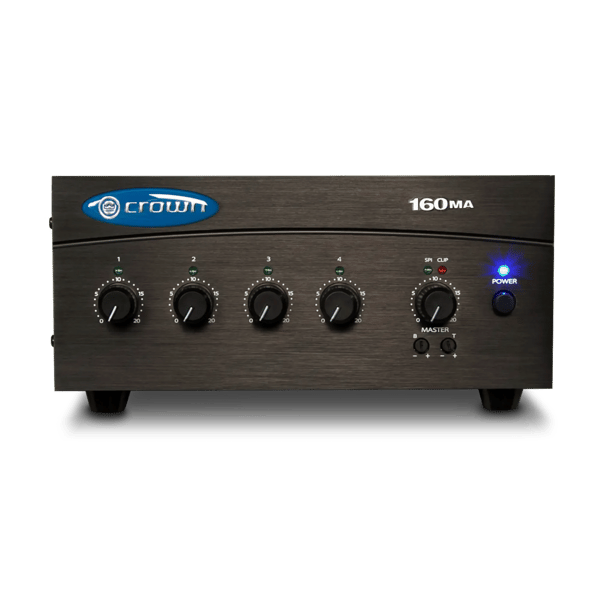Crown's 135MA and 160MA are high value mixer-amplifiers for commercial audio. They provide 8-ohm and constant-voltage outputs (70V and 100V). Typical uses are paging, background music, and music-on-hold. The 135MA provides 3 inputs (each with a volume control) and a 35W amplifier output. The 160MA provides 4 inputs (each with a volume control) and a 60W amplifier output. Other features include priority muting, voice activated muting, phantom power, and bass and treble controls.