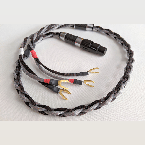 Nirvana adapter terminated with spades on the amp side and a 4-pin XLR connector on the headphone side for stereo amplifiers driving low-sensitivity headphones. Contact us at gingko@gingkoaudio.com if you need a double 3-pin XLR on the headphone side.