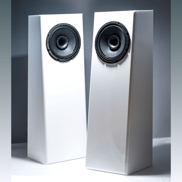 The original Amber with wood cabinet was introduced in July, 2023. In March, 2024, DH introduced Amber Midnight, built in solid mirror finish Waveglas™ material due to outstanding performance advantages. Waveglas™ is non-porous, is 2.5 times the density of wood, and less resonant. The radius front panel of Amber Midnight enables better imaging.