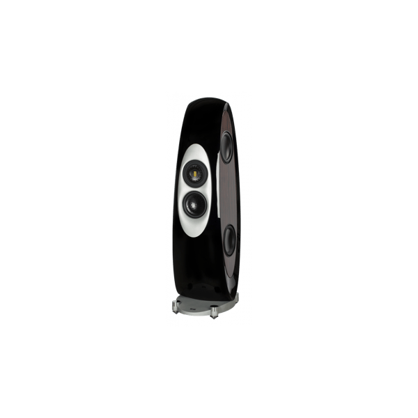 The aluminium sandwich woofers in a push-push/pull-pull arrangement are characterized by high internal damping (cardboard cone) and high torsional rigidity (aluminium dome) and deliver an enormous but controlled bass down to the deepest subsonic range. Oval side panels made of solid wood, laminated with carbon fiber or leather, frame two side-firing 250 mm woofers on each side of the cabinet.