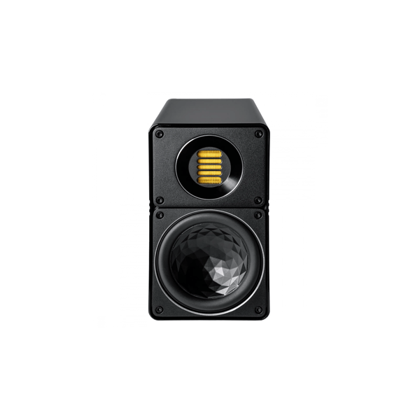 The eye catches sight of the high-gloss lacquered cabinet and the aluminum parts of the drivers at the front. The woofer features a black anodized aluminum membrane with crystal-shape.