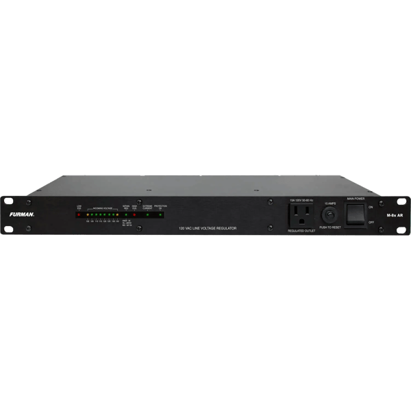 The M-8x AR includes special circuitry to sense over and under voltage conditions and either regulate or disable the output before damage can be done to connected equipment. Please refer to the specifications for the exact voltages at which shutdown occurs. When the input voltage falls outside the regulation limit, the power will cut off. Power will automatically be restored when the condition has subsided. The two red LEDs labeled “EVS” indicate a protective shutdown condition