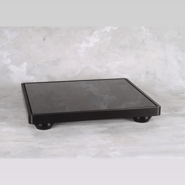 A finely polished black granite contact plate is combined with the two custom resonance control stages inside the billet machined aircraft aluminum frame. The external visual surfaces of the frame have a craftsmanship finish and special HRS black anodize coating. This exceptional design was created to offer maximum performance, cosmetic elegance, and a very durable scratch-resistant inlay design that will provide years of maintenance-free service. The low profile (3-inch high) design also minimizes space requirements and keeps the visual focus of your system on the components you have selected.
