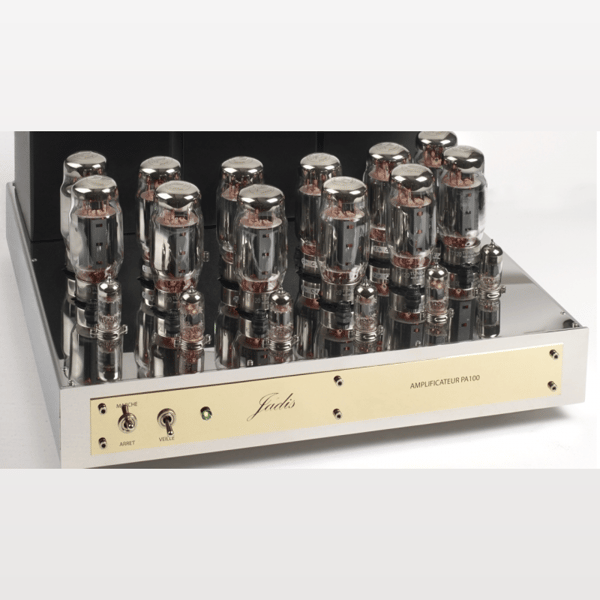 The Jadis PA100 is a stereo power amplifier that uses 12 power tubes. It produces a total power output of 150W in AB class. At the first sight one can see that this power amplifier is definitely from the Jadis' line of products. Golden front plate, high quality chassis, point-to-point wiring, massive output transformers and power transformer. As for all Jadis' units the PA100 is handcrafted in Villedubert in the Languedoc area.