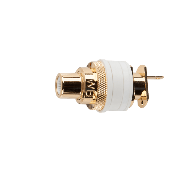 The outer contact is made of a special copper alloy and is 24 carat gold-plated, not only ensuring excellent conductivity but also preventing oxidation, which could impair the contact quality. The inner contact is made of pure, highly conductive electrolyte copper and also gold-plated. This contact is designed in the form of an active spring contact so that the double prism contact surfaces are pressed onto the central pin of the RCA plug by a surrounding bronze spring ring. Not only does this ensure reliable contact with non-standardised RCA plugs but contact also remains reliable even after the plug has been connected and disconnected many times over.
