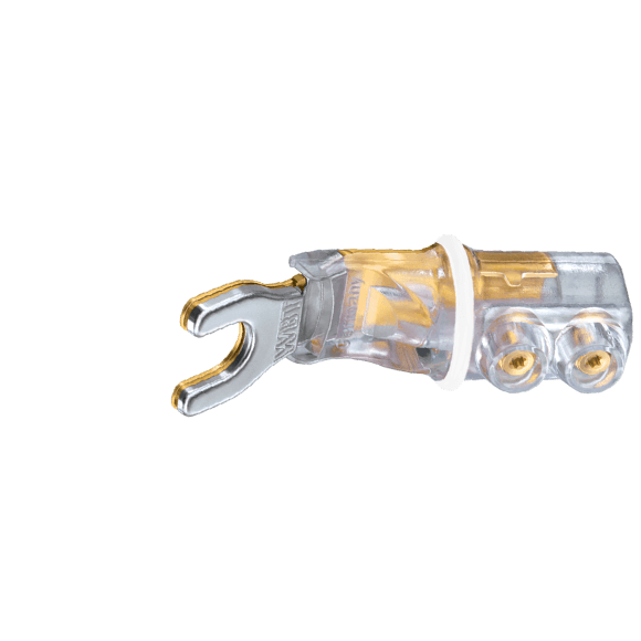 1/4" / 6.4mm sandwich spade connector. Pure Copper contact is direct Gold plated to protect against tarnish and oxidation. High current spade lug with elastomeric shock absorber for progressive contact pressure eliminating structure born and air born noise as well as magnetostriction. Fully insulated body is safe to use and conforms to international safety standards. Warning against usage of contact cleaners: their contents may cause damage to polycarbonate insulators.
