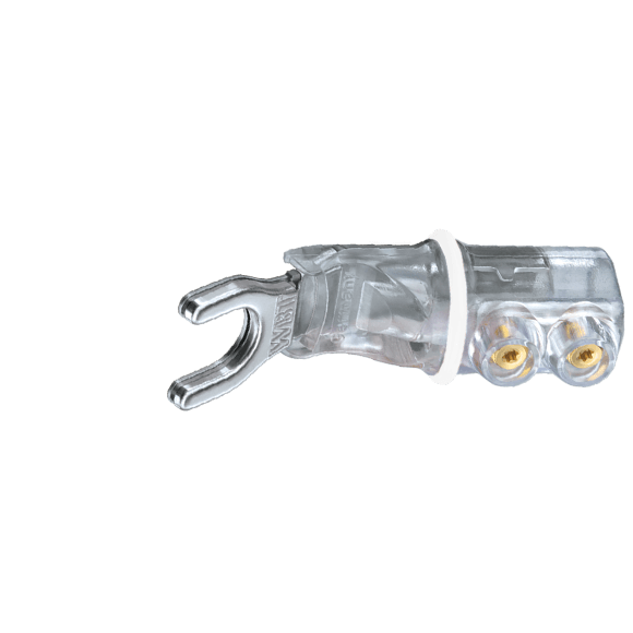 5/16" / 8.1mm sandwich spade connector. Pure Fine Silver contact is direct Platinum plated to protect against tarnish and oxidation. High current spade lug with elastomeric shock absorber for progressive contact pressure eliminating structure born and air born noise as well as magnetostriction. Fully insulated body is safe to use and conforms to international safety standards. Warning against usage of contact cleaners: their contents may cause damage to polycarbonate insulators.