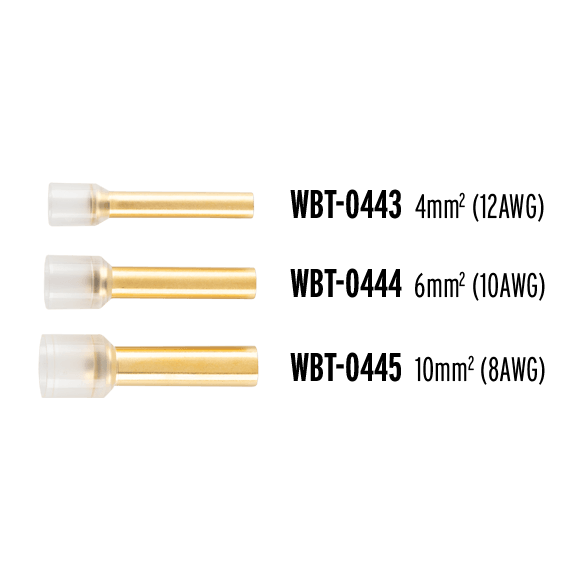 The WBT crimp sleeves are made of oxygen free copper and plated with 24k gold. They have a transparent insulation collar that provides additional strain relief. We offer 3 sizes: WBT-0443: 4mm (12 AWG, will fit 4TC or 4PR) WBT-0444: 6mm (10 AWG, will fit 8TC or 8PR) WBT-0445: 10mm (8 AWG will fit 12TC) WBT crimp sleeves work well with WBT speaker connectors, WBT-0610WBT-0661, and WBT-0681. WBT recommends using the WBT-0403 crimping pliers for WBT crimp sleeves.