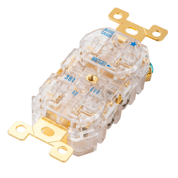 ★ Audio Grade receptacle. Heavy-duty clamp with teeth terminals. Heavy-duty triple wipe contacts. Accepts 8 to 12 awg wire. Gold plated solid brass terminal clamps, mounting strap, rivets, and grounding strip. All polycarbonate design. All non magnetic materials. Phillips head hardware. Wattgate Three Layer Plating Process* 15A/125VAC - 20A/125VAC