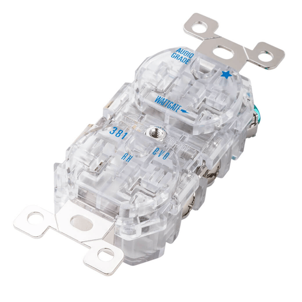 ★ Audio Grade receptacle. Heavy-duty clamp with teeth terminals. Heavy-duty triple wipe contacts. Accepts 8 to 12 awg wire. Rhodium plated solid brass terminal clamps, mounting strap, rivets, and grounding strip. All polycarbonate design. All non magnetic materials. Phillips head hardware. Wattgate Four Layer Plating Process* 15A/125VAC - 20A/125VAC