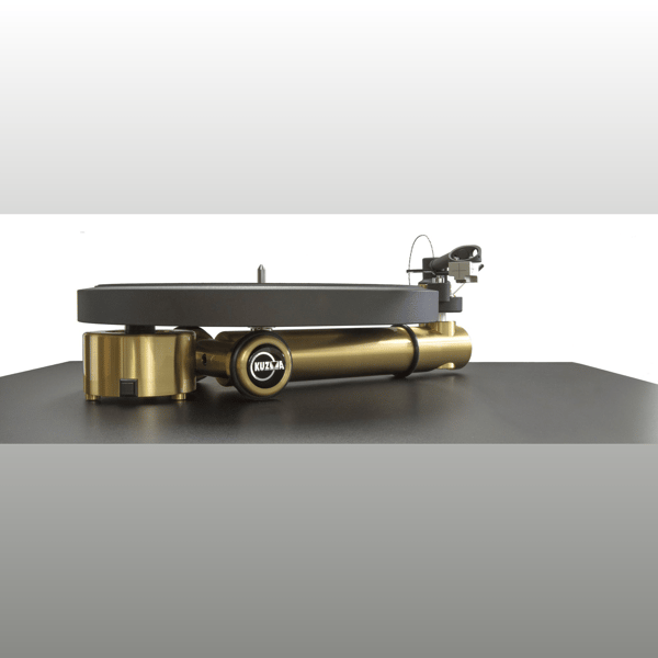 Stabi S is our smallest turntable with a design approach normally found only in more expensive models. Its unique shape and construction of solid brass rods, provide an extremely rigid connection to platter, bearing and tonearm support. There is no flat plate to resonate and transmit vibrations, only solid brass rods 50mm in diameter. A second brass rod provides stability and the two are clamped together in a T shape. The motor is housed independently in its own bras tower which dampens vibration of the motor itself. A ground, flat belt provides drive from the motor pulley to the subplatter.