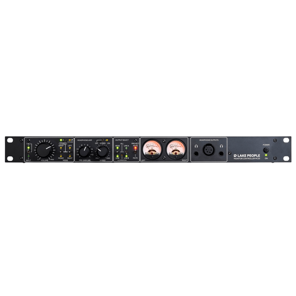 The Lake People Monitor Controller MC50 offers two inputs, a slave output, two line outputs to connect amplifiers or active speakers, a true balanced headphone amplifier with 4 power stages equipped with front controlled Pre-Gain and X-Feed – thus much more than conventional Monitor Controllers in 19“, 1 U format. The complete set of stereo signal manipulation options, Solo L, Solo R, Channel Swap, Mono, Right Channel Phase Reverse and the high-quality RK27 volume control with 41-detent make it stand out from the crowd. In addition, it is as low in noise and distortion as physics allows.