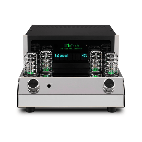 Input selection, bass, treble, tone bypass, balance and input offset levels can be adjusted using the front panel knobs or the included remote control; all settings, volume level, and input selection will be shown on the front panel display. The C8 sits atop a stainless steel chassis that's polished to a mirror finish; classic McIntosh-styled die cast aluminum name badges are attached to each side. It has a black glass front panel with silver trim, an illuminated logo, and rotary control knobs. Contact your local dealer to learn more.