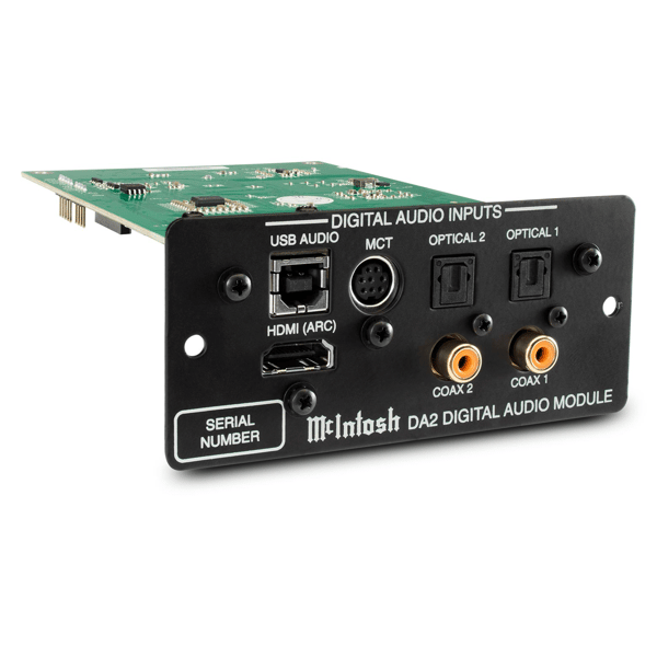The DA2 Digital Audio Module builds upon the DA1 with an expanded set of capabilities. In addition to having all the same connections as the DA1 (2 coaxial, 2 optical, 1 USB and 1 MCT) a new audio-only HDMI Audio Return Channel (ARC) connection is included on the DA2. This allows it to be connected to TVs with a compatible HDMI (ARC) output to bring your TV sound to the next level by listening to it through your home stereo system. ARC functionality can provide two-way communication between your DA2 equipped unit and TV, allowing for volume control and lip-syncing functions to ensure the audio and video are perfectly synched. Popular multi-channel audio formats from Dolby and DTS are supported and will be expertly converted to 2-channel audio for proper playback through your DA2 equipped unit. When CEC communication is enabled in both the DA2 equipped unit and your TV, your TV remote can control the power and volume of your connected McIntosh unit.