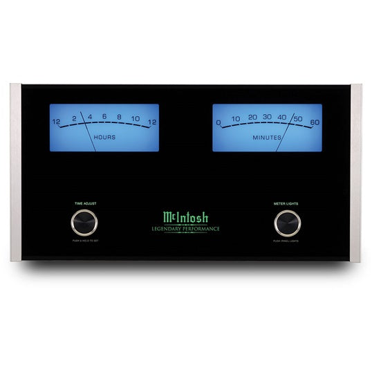 The left meter measures hours while the right measures minutes. The hour and minute hands cover a twelve and sixty minute arc respectively on the MCLK12 along with Power Output Meters on compatible McIntosh poweramplifiers. Both hands 'fly-back' in a retrograde fashion when they reach the end of their scale. The MCLK12 is the ultimate fun way to monitor the passing of time. Battery backup keeps time during power outages.