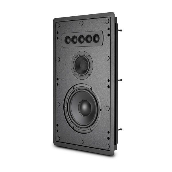 The key to the WS350 In-Wall Loudspeaker’s performance lies in the unique deep drawn aluminum back enclosure that houses the driver array. This design minimizes sound transmission into adjoining rooms, keeping the sound from escaping through the walls of the listening room and helping to deliver encompassing surround sound. The WS350 features one 8” woofer, one 4” midrange and five 1” tweeters. The black frame’s flanges can be painted to match your wall color. A white aluminum grille magnetically attaches to the frame and covers the entire speaker and frame; the grille can also be painted to match your wall color.