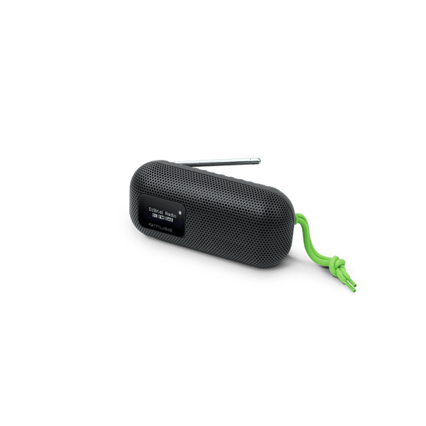 The M-760 DBT combines a 10W Bluetooth speaker with 6-hour battery life and an FM/DAB+ radio. It features a backlit LCD display, IPX4 splash-proof design, and allows recording of 10 presets for simplified access to radio stations.