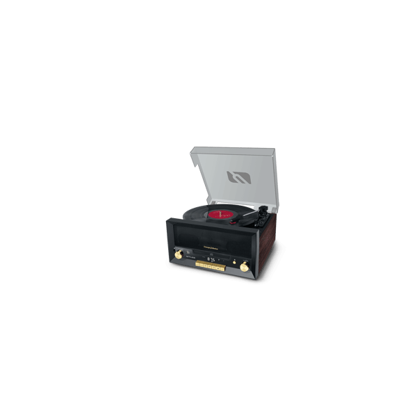 The MT-112 W micro system features a CD player, a turntable, a USB port for playback and encoding, an FM tuner with 20 presets, and Bluetooth functionality. It is equipped with built-in speakers delivering 20W of power.