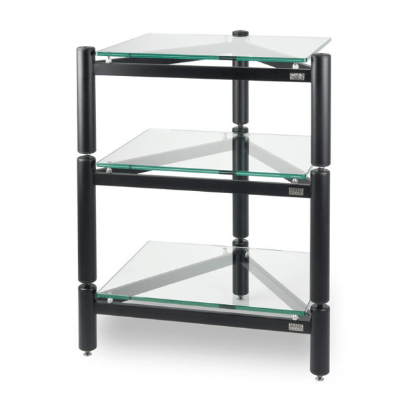 However, it is always possible to install (optionally) a set of adjustable chrome-plated brass spikes which also take care of leveling and therefore independently stabilizing each individual shelf.