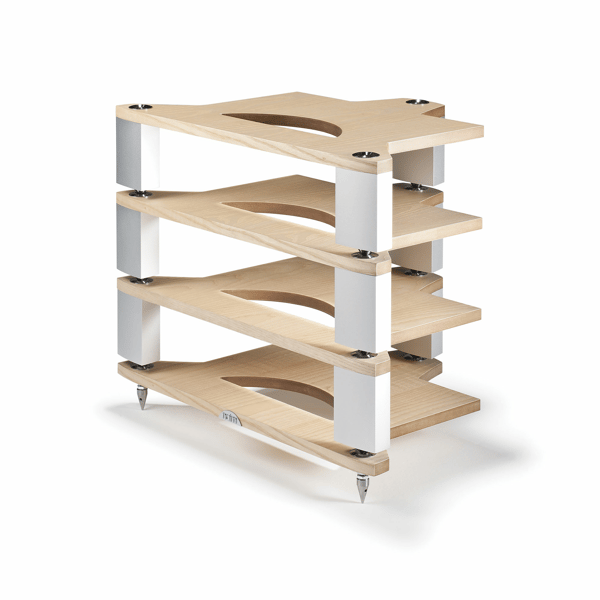 Unlike the two-stage base level isolation of Fraim, FraimLite has a single set of three cone and cup minimal contact interfaces. Also, instead of using glass sub-shelves, each level of FraimLite supports equipment directly on veneered composite panels.