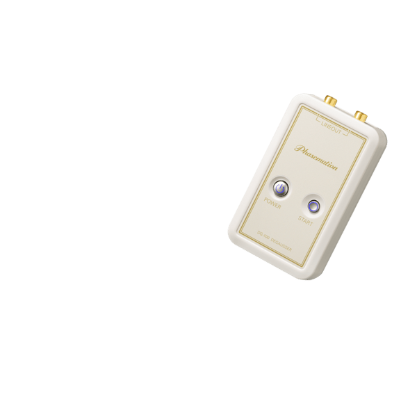 By short-circuiting the MC cartridge while the vinyl record is being played, the MC cartridge can be degaussed. For example, a cartridge with impedance of 4Ω and an output voltage of 0.3mV has a degaussing current of 0.075mA. Similarly, a cartridge with an impedance of 40Ω and an output voltage of 0.3mV has a degaussing current of 0.0075mA. Since the degausser, DG-100, flows out about 50 times more degaussing current, the degaussing effect is doubled.