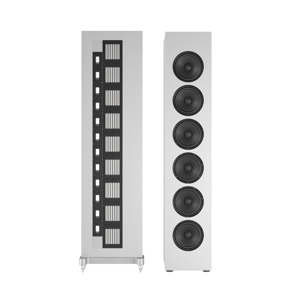 The PIEGA Master Line Source, the flagship model in PIEGA's range, is a marvel of audio engineering and design. Embracing the revered line source principle, this speaker delivers sound in coherent cylindrical waves, offering an expansive membrane area and remarkably low distortion. It features a dual-component design: the main tower, with 24 ribbon tweeters split between the front and rear, alongside nine dipole midrange ribbons for a nuanced sound profile, and a separate bass tower housing six 22 cm subwoofers for deep, resonant bass. The sleek, polished aluminum cabinet enhances its aesthetic appeal. Crafted with precision and care by PIEGA's skilled artisans, the Master Line Source is more than just a speaker – it's a statement piece that offers unparalleled sound quality, embodying the pinnacle of loudspeaker technology and craftsmanship.