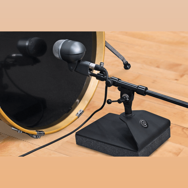Low frequencies coming from wood or metal flooring on a live stage can travel through metal such as a microphone stand to create unwanted resonance that can negatively impact your live mix. This is particularly the case with kick drum mics, positioned directly in front of the kick where low bass and vibration are common. Primacoustic’s KickStand is a heavy microphone boom-arm isolator that combines a massive stabilizing base with an isolation pad to eliminate resonance from the stage, drum riser and studio floor from entering the microphone. The design combines a thick, high-density open cell acoustic foam isolation pad with a laser cut steel platform to essentially decoupling the microphone stand from the stage and eliminate unwanted resonance.