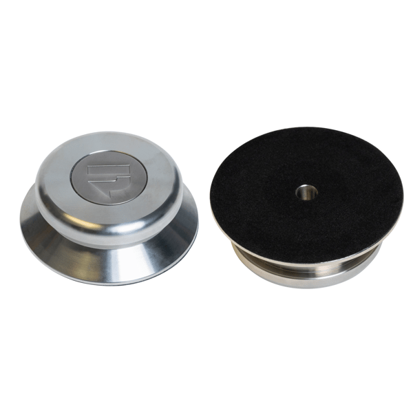 Comes standard on the “E” Line. If the record is not properly seated on the platter, your sound can be degraded by vibrations and departures from flatness. That’s why the turntable comes equipped with the SS-1, a solid stainless steel record weight with black felt on the underside. It slips over the record spindle to dampen vibrations and flatten your LPs. The result is an increase in resolution and a lower noise floor. The SS-1 measures 0.75” high x 2.75” wide and weighs 1.6 lbs. (20 mm x 70 mm; 750 g).