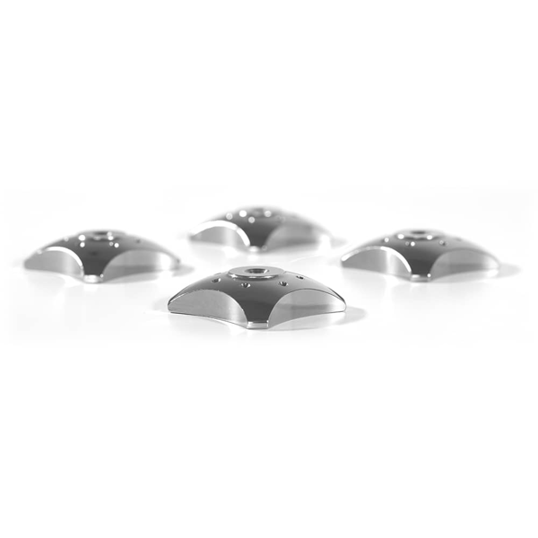 The larger QX7 Heavy Duty Floor Protector are designed to house heavier weight performance rack and speakers. These shoes are machined from stainless steel and designed in the shape of our racks to improve sound performance.