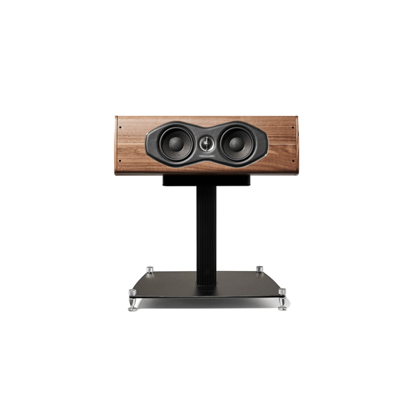 The Olympica Nova Stand for center channels, Olympica Nova CI e CII, crafted from aluminum with stainless steel spikes, mirrors the design philosophy of the Olympica Nova bookshelf stand.