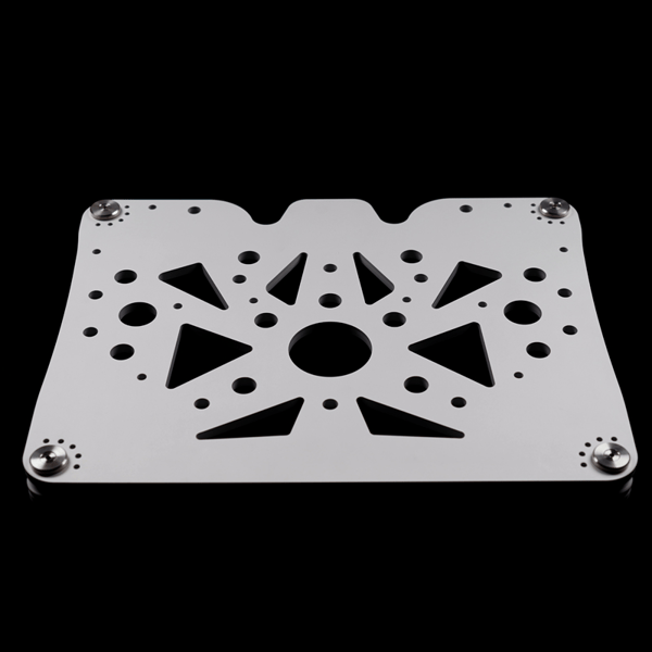 Thus the platform base plate is rigid design machined from solid 10mm thick aluminum, strategically drilled with the holes of different diameters and with triangular openings, where the dimensions, shape and plan of openings and holes follow the Fibonacci sequence and Golden Section ratio rules in order to damp all the equipment born vibrations evenly across the wide frequency range.