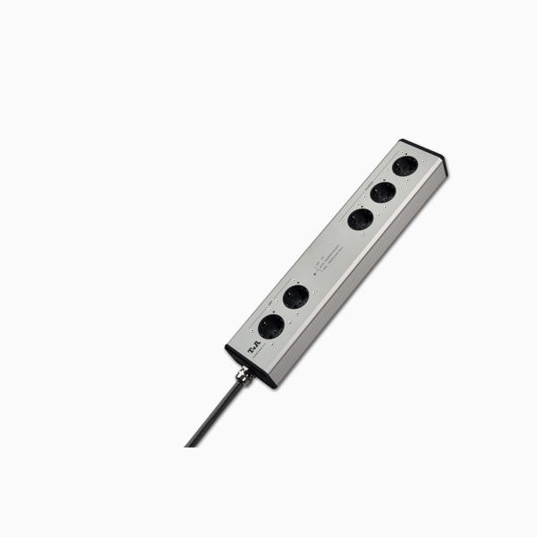 This distribution panel has two sockets for analogue and three sockets for digital devices. Sophisticated High-End systems may consist of a vast range of different components, and invariably consume very high currents. This places considerable demands on the method of distributing mains power to the individual machines in the system.