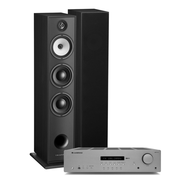 The BR08 speakers deliver a spacious and energetic soundstage, characteristic of Triangle’s performance-oriented floorstanding models. Their three way design delivers a full range and a well balanced presentation. The twin 16 cm woofers provide deep and controlled bass, while the dedicated midrange driver and tweeter handle the rest of the spectrum with clarity and precision. They are paired with the Cambridge AXR100, a powerful 100 watt stereo receiver offering strong drive, modern connectivity and a smooth, balanced sonic signature.