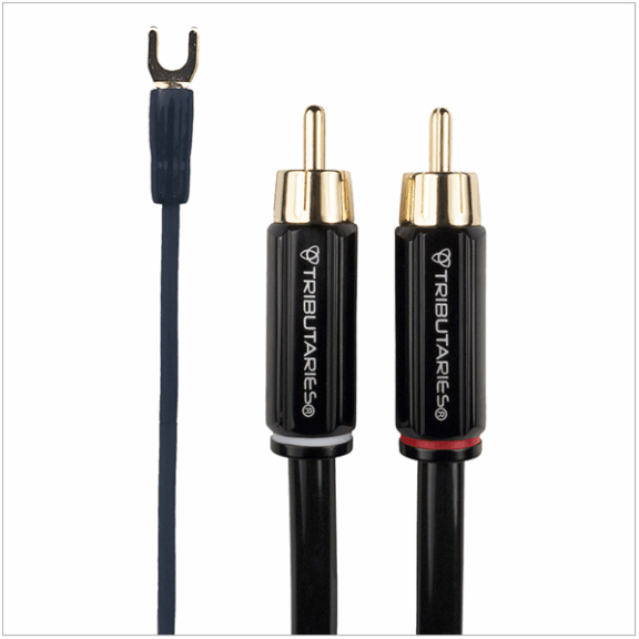 All Series 4 audio cables are assembled by hand in Orlando, Florida. The Series 4 phono cable set is comprised of a S4 Single-Ended RCA audio cable and ground wire. Series 4 Single-Ended RCA cables begin with ultra-pure highly conductive oxygen free copper (HC-OFC) developed specifically for audio applications. Each conductor is a solid single gauge wire chosen to support multiple frequencies and to prevent grainy distortion caused by stranded wire. Tributaries Twin-Axial cable design is perfect for unbalanced analog audio systems. In the Twin-Axial design there are dedicated conductors with equal impedance for positive and negative signals. The signal conductors are wrapped with dual shielding to keep noise from reaching the single path. The ground wire is a flexible 20AWG stranded wire terminated with a gold plated spade lug that will fit ground posts that are 4mm and smaller. The Series 4 Single-Ended RCA cable is a high performance cable that looks as good as it sounds