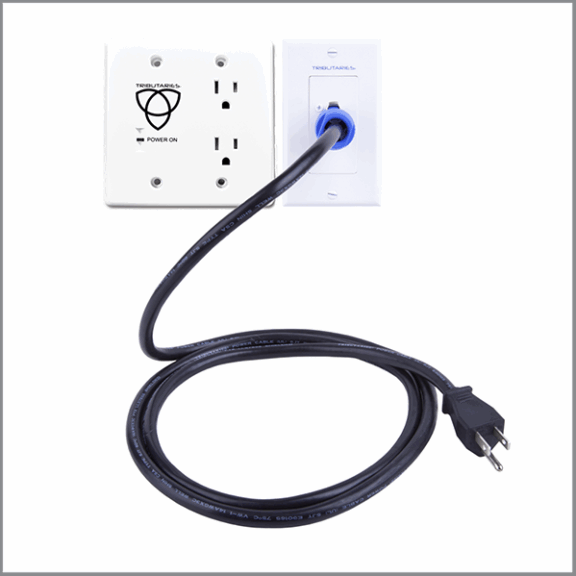 Tributaries PWRI-XF is an in-wall power extension kit that provides a second layer of filtration at the remote location. This extra filtration is designed to clean up unwanted interference from in-wall unshielded Romex cabling to keep your electronics performing at their best. Tributaries XF is designed with two outlets that fit in dual gang Carlon or Raco boxes. Why dual gang? Because there are large copper chokes inside to effectively eliminate noise on the line. Power extension kits are commonly used to extend surge and filtration from a surge suppressor like Tributaries T10X to a remote device. In addition, including these remote electronics on the same ground as the rest of the system reduces the risk of ground loop issues. The One of the main features of the XF is a locking connector system which safely connects the connector to its mate on the inlet wall plate. The blue Neutrik connector is UL rated and designed specifically for safe power applications. The twist-to-lock feature allows current to flow when fully inserted and twist-locked into place. With no exposed connections, this is the safest connection available on the market. The PWRI-X is considered a dead branch circuit, and per the NEC code of 2008, it is not necessary for a licensed electrician to install. The PWRI-XF outlet is finished in a paintable matte white face plate. A green LED on the faceplate illuminates when power is connected.