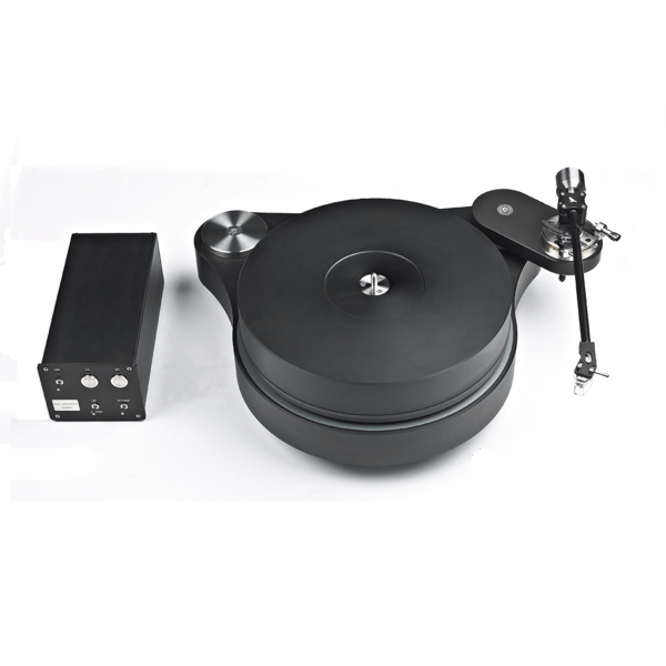 The basic shape is similar to the Raven One. However, unlike the Raven One, the 22kg chassis of the GT is made from black anodised Aluminium, and due to sits shape is considerably more compact and takes up little more space than a 12" LP. The ability to attach two tonearms was the basis for the design. We have dispensed with the elaborate alteration involving a separate motor housing which was the case with the Raven One. The GT’s motor is located directly in the chassis, right behind the 6kg platter, so that the distance between the platter and motor pulley is kept to an absolute minimum. This allows the use of an extremely short belt which makes contact with almost the entire circumference of the platter. This allows us to attain wow and flutter values of 0.02%, almost unheard of with belt drive turntables and normally only associated with the very best of recent Japanese direct drive turntables.