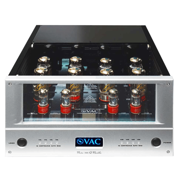 The input and driver circuits are direct coupled and implemented with highly linear low mu octal triodes operated in full Class A1. The output stage employs the legendary KT88 beam power kinkless tetrode, with bias optimized by VAC's patented* iQ Intelligent Continuous Automatic Bias System for ‘plug and play' reliability and automatic notification when a tube change is advisable.
