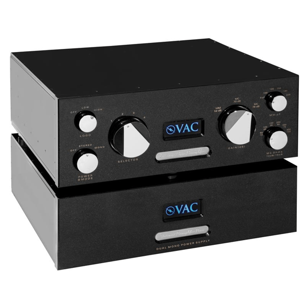 This VAC Statement dual mono triode vacuum tube phono (MM/MC, three gain modes, adjustable load, stereo/mono operation) preamplifier is designed for extreme applications. On the back panel there are two DC umbilical cords and large Amphenol aerospace connectors, a reminder of the massive dual mono power supply. There are inputs for four independent phone sources. In addition, each input may be of the conventional single-ended type or may be fully balanced.