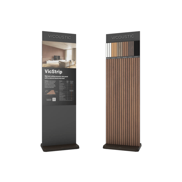 With a sample of the four VicStrip finishes, this display was thought to be placed in stores or tradeshows promoting the VicStrip product. A comparison chart between the VicStrip and other common slat panels is shown, explaining why VicStrip is the best choice.