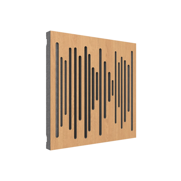 This panel is made of high-density polystyrene and wood finish. The idea is to have a more competitive diffuser with low weight and easier application. It matches perfectly with the usual Wavewood absorption panel which means you can combine both absorption and diffuser versions without noticing any differences in terms of aesthetics.