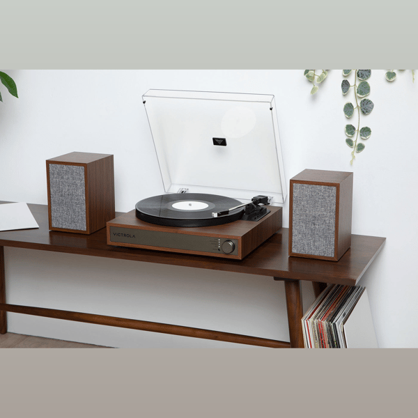 The Victrola Harmony turntable system blends classic mid-century design with premium stereo sound for a rich, immersive listening experience.