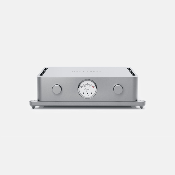 The front panel of the Brama Preamplifier is intentionally free of screens and distractions, favoring the gentle glow of a custom analog gauge and the tactile precision of Swiss rotary switches.